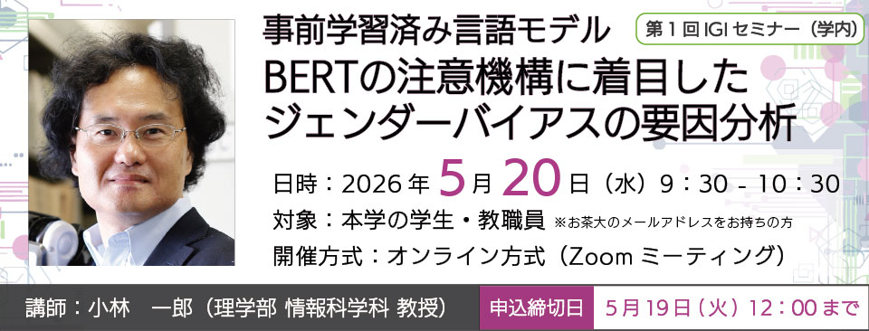 【学内限定】IGIセミナー「事前学習済み言語モデルBERTの注意機構に着目したジェンダーバイアスの要因分析」(2026年5月20日)