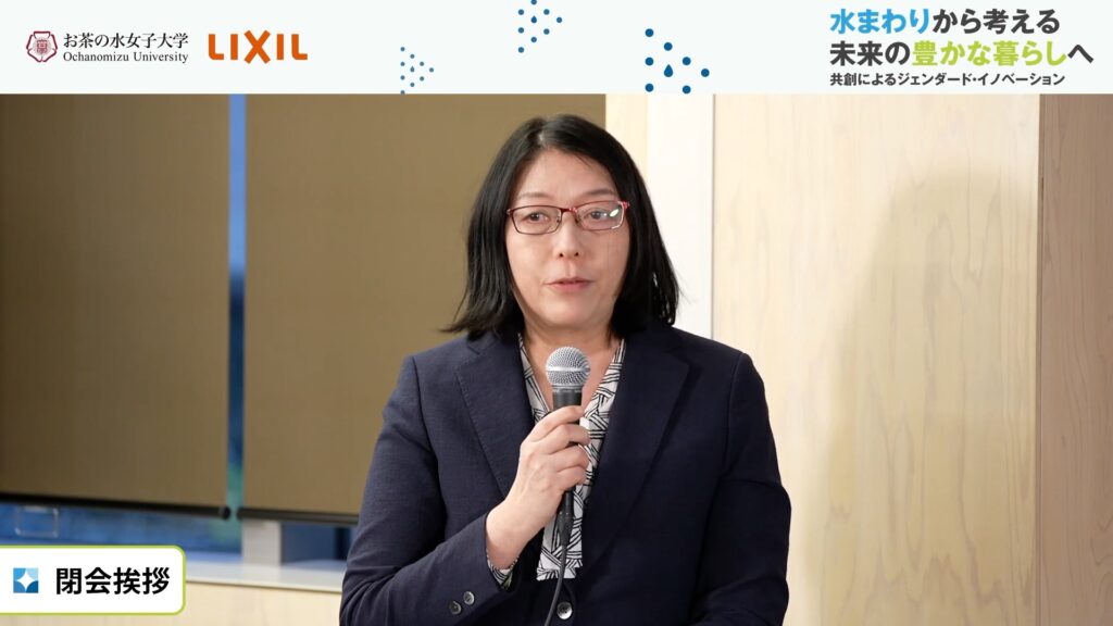 閉会の挨拶に立ったお茶の水女子大学ジェンダード・イノベーション研究所副所長斎藤悦子氏からは、参加者と登壇者への感謝の言葉と合わせて、お茶の水女子大学とLIXILの連携により、未来の水まわりが誰にとっても使いやすく快適な場となること、豊かな日常生活を実感できるウェルビーイングの追求が進められることへの期待が述べられた。