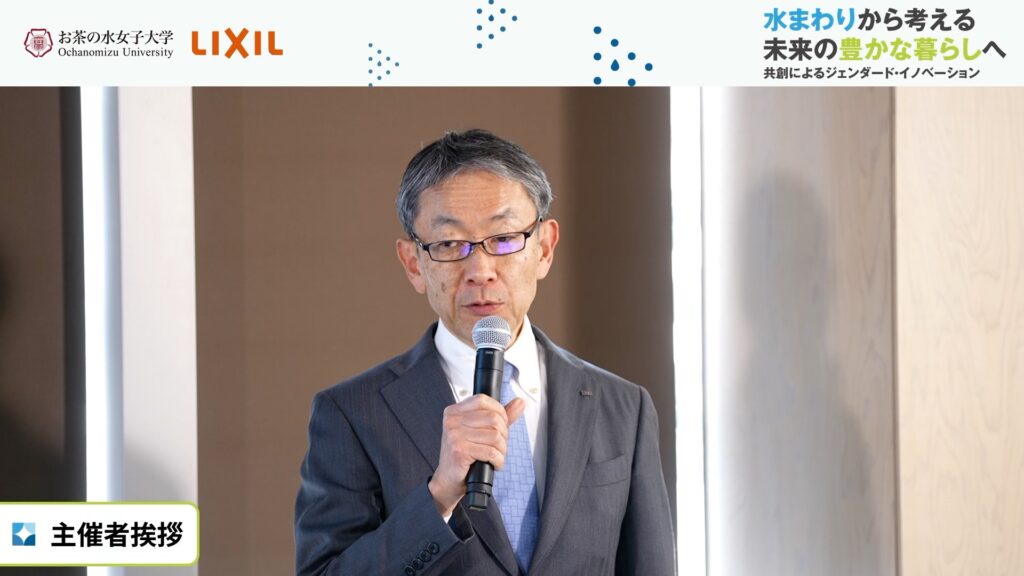 こうしたジェンダー視点は、未来の生活空間を考える上でも不可欠であるが、それをする組織そのものも、多様性を確保して、異なる視点がぶつかり合って新しい問いを生み出すイノベーションの場になることが重要である。水谷氏は、LIXILが掲げる3つの戦略、「衛生問題の解決」、「環境負荷の低減」、「多様性の尊重」は、いずれもジェンダード・イノベーションと深く結びついていると話し、お茶の水女子大学の研究力とLIXILの実装力が組み合わせることで、水回りの常識を塗り替えるような成果を生むことを確信しているとの期待を述べて挨拶を結んだ。